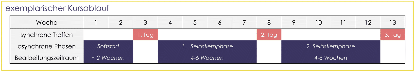 Insgesamt hat der Kurs eine Dauer von ca. 3 Monaten. Ein exemplarischer Kursablauf ist in Abbildung 2 dargestellt.